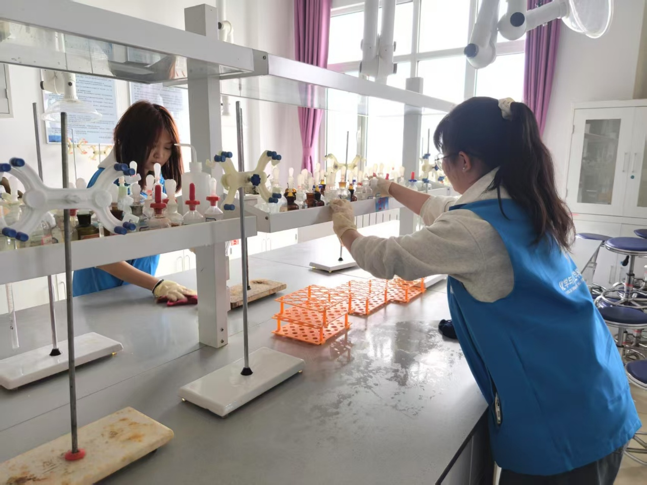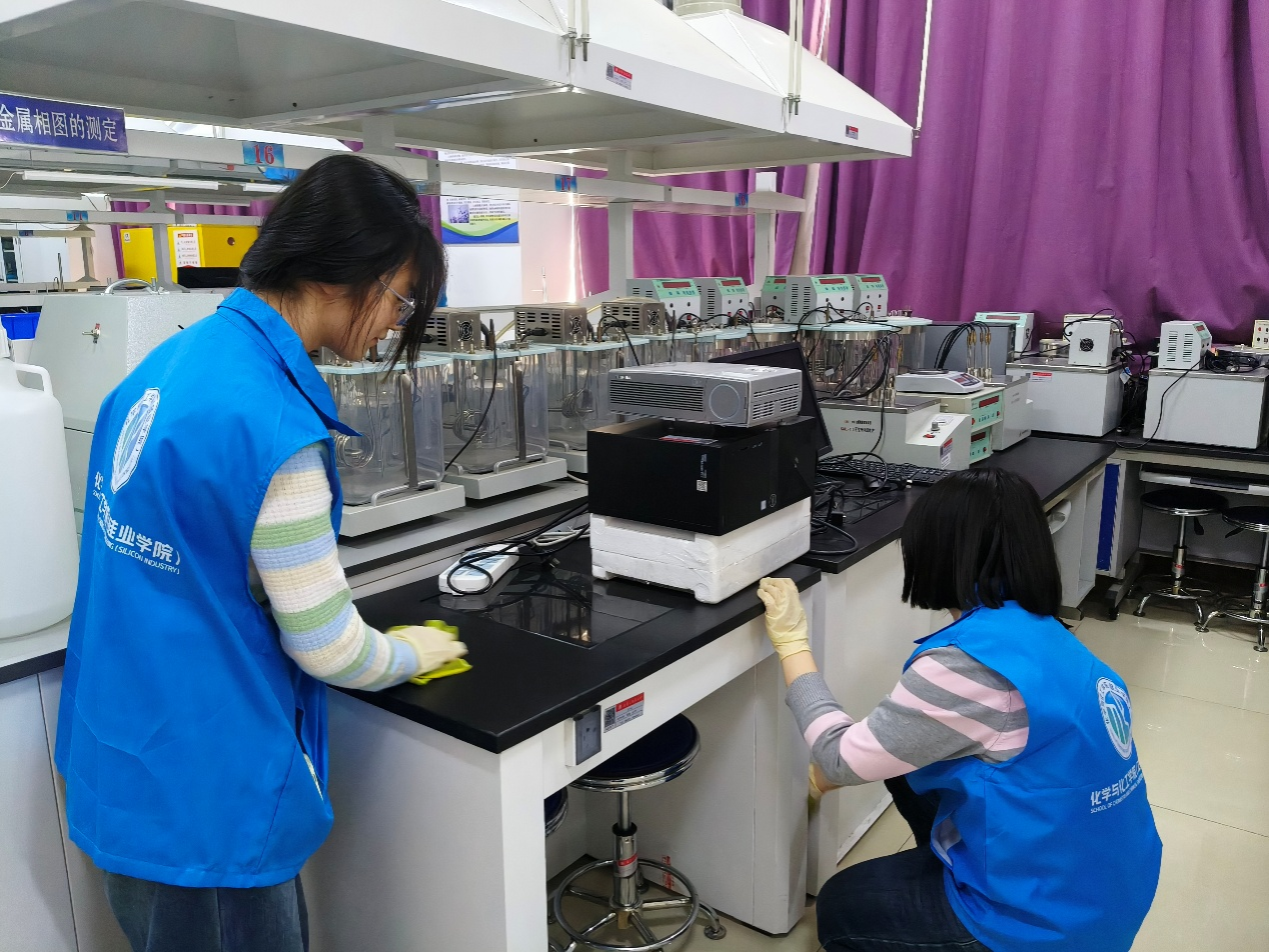 志愿者在实验室教师指导下,清洗玻璃器皿、全面擦拭实验台面油渍污垢,清洁地面顽固化学残留,并按类别和规格有序摆放试剂瓶,记录水电线路等隐患点并同步报修‌。