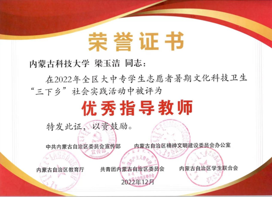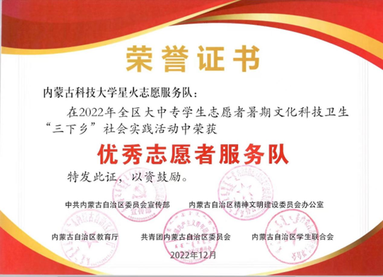 近日,中共内蒙古自治区委员会宣传部内蒙古自治区精神文明建设委员会办公室内蒙古自治区教育厅共⻘团内蒙古自治区委员会内蒙古自治区学生联合会下发了《关于表彰2022年全区大中专学生志愿者暑期文化科技卫生“三下乡”社会实践活动先进集体和优秀个人的决定》,授予91吃瓜