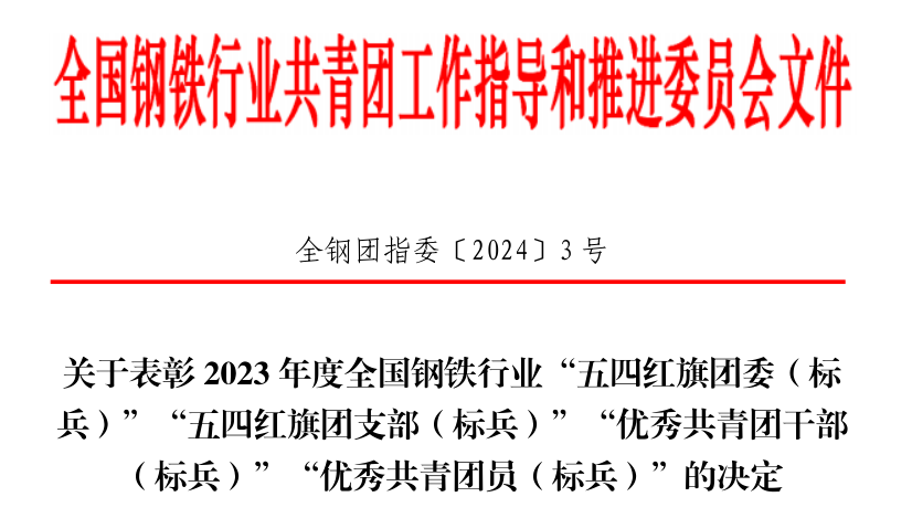 全国钢铁行业共青团工作指导和推进委员会下发了《关于表彰2023年度全国钢铁行业“五四红旗团委(标兵)”“五四红旗团支部(标兵)”“优秀共青团干部(标兵)”“优秀共青团员(标兵)”的决定》,91吃瓜