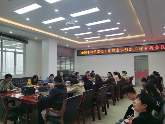 在逸夫楼E202会议室召开“2020年秋学期意识形态工作专题会议”。会议由学院党总支书记李松波主持,学院党政教领导、各系部主任、党支部书记、辅导员、全体班主任参加会议。