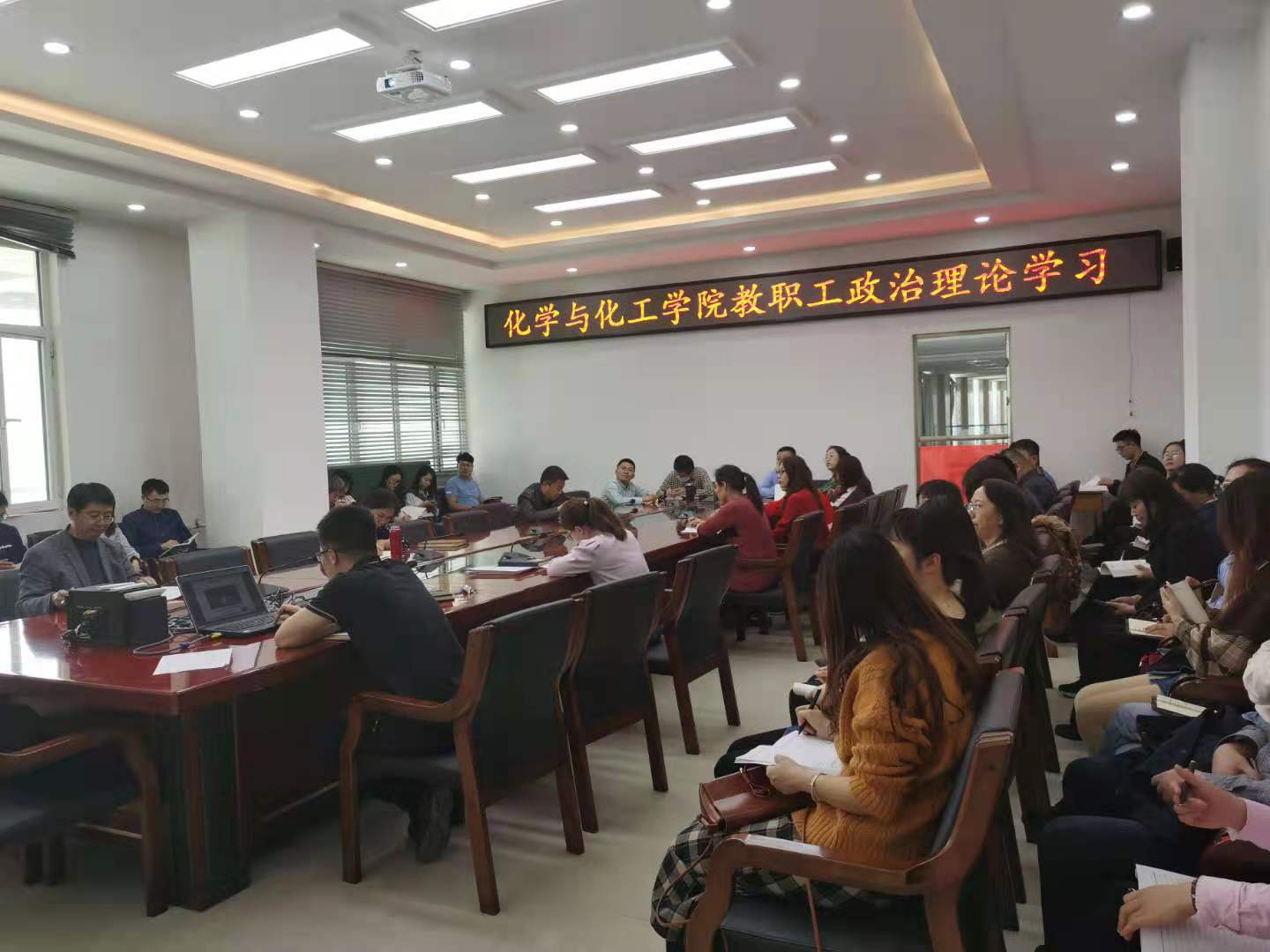 在逸夫楼E202会议室开展教职工政治理论学习。全体教职工参加学习。本次学习内容为:2021年全国两会精神学习。