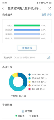 此次培训共安排课程32学时,分为开班仪式、网络理论学习、撰写学习心得、教师授课、专题研讨、结课考试六个环节,其中网络理论学习18学时,教师授课6学时,研讨2学时,自学4学时,结业考试2学时。培训课程紧紧围绕中国共产党的性质、党的十九大党章、党的伟大精神、党的历史等方面内容,线上课程选用共产党员网、学习强国等官方平台内容,学院教师冀虹、梁玉洁、樊易分别讲授了“社会主义核心价值观”、“入党动机与入党条件”“伟大抗疫精神”专题党课。培训后同学们撰写了心得感悟,并于11月22日晚进行了主题分享。结课考试依托“雨课堂”进行,于11月24日完成全部考试,按照培训计划,对所有同学的分数进行了核算,最终110名同学全部合格,达到培训预期目标。