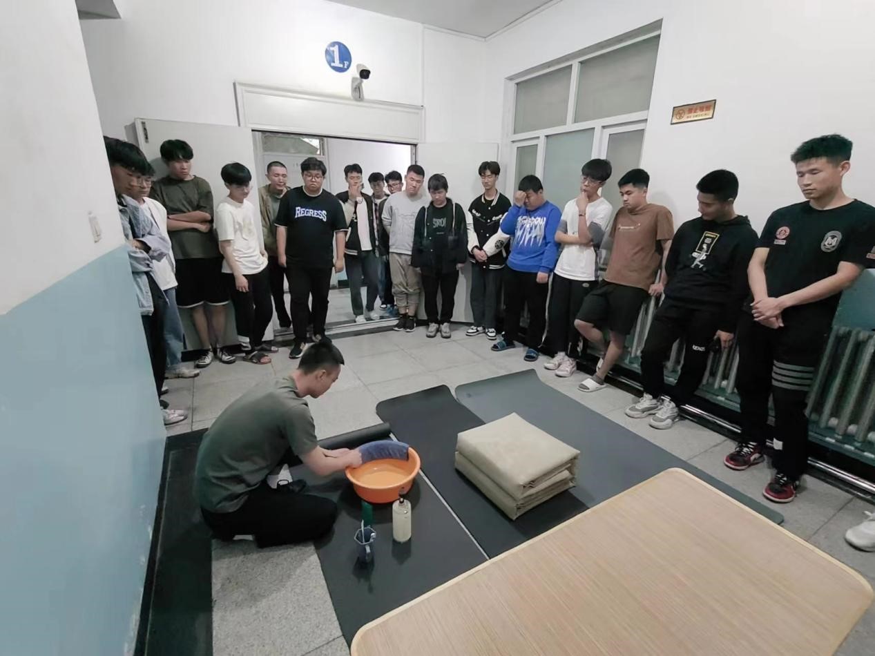 李岩、魏刚、索良发等八名退伍大学生进行示范,大一至大三各班级代表进行了观摩学习。