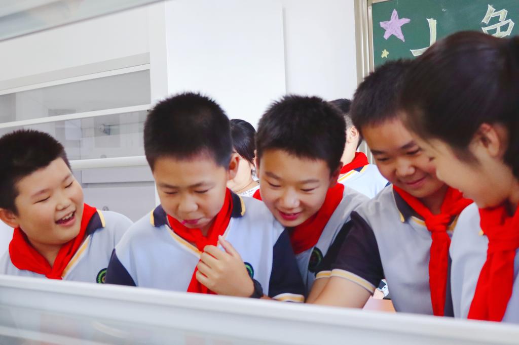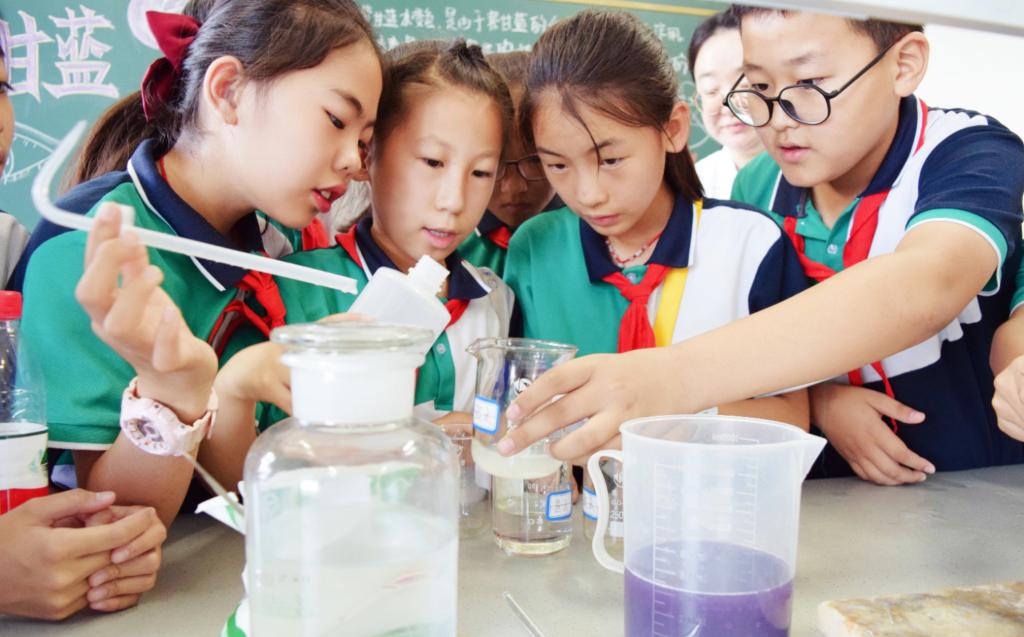王丽和杨卉两位老师演示了紫甘蓝变色科普实验。紫甘蓝中含有大量花青素,是水溶性的植物色素,随酸碱性的不同而显示不同的颜色,将紫甘蓝汁分别倒入白醋、盐水、自来水、碱水中,溶液依次呈现桃红色、紫色、蓝色、黄色。孩子们听得津津有味,意犹未尽。通过生动有趣的实验视角,带领小学生探索科学的奥秘,让爱科学、学科学、用科学、崇尚科学逐渐成为少年儿童的主流价值追求,让科学的种子在孩子心中生根发芽。