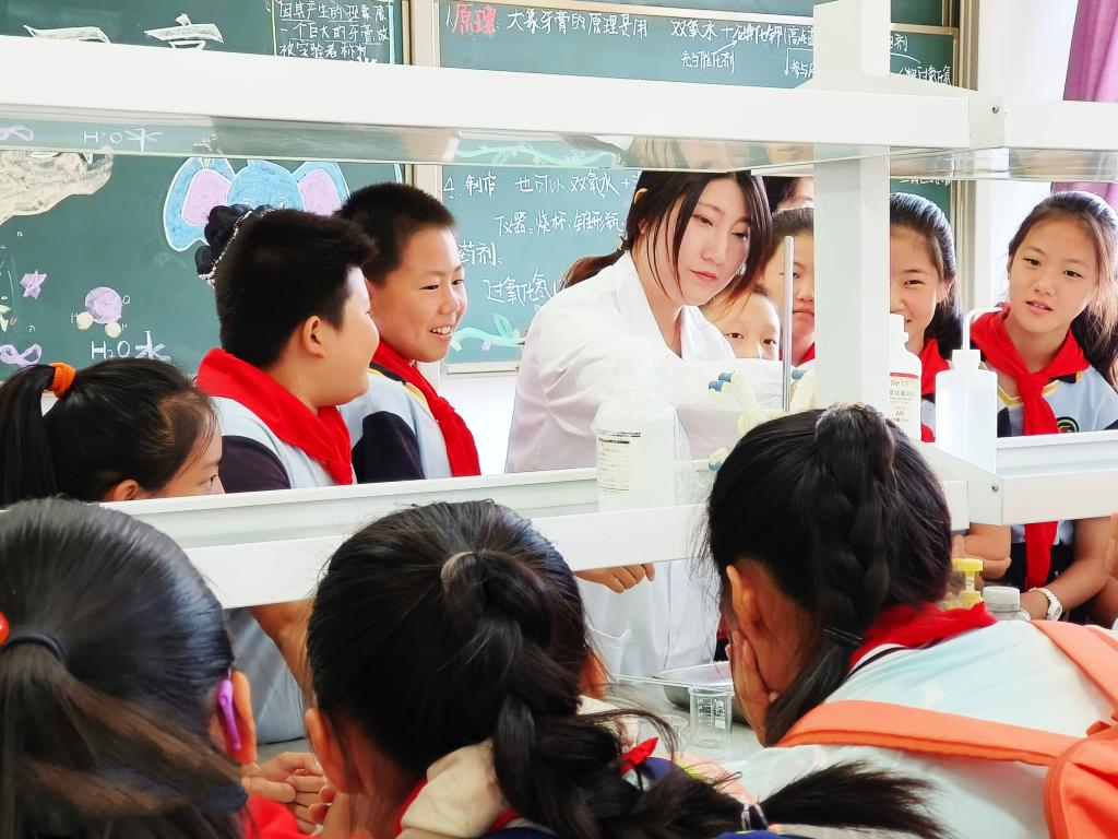 马庆和陈晓霞两位老师为小学生们演示了有趣刺激的大象牙膏实验。利用碘化钾、二氧化锰催化加速过氧化氢分解的原理,迅速产生大量的泡沫,反应前后体积变化巨大,充分激发了孩子们的好奇心和对化学的热情,有着重要的启蒙意义。