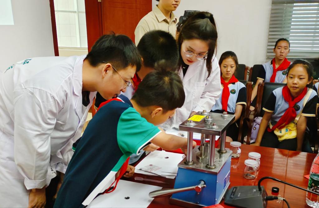 学生志愿者还带领小学生们参观了其他实验室,他们近距离看到了各种“高、精、尖”仪器设备,同时也看到了实验室里身着白大褂的青年追梦者认真钻研、精益求精的样子,激发了孩子们对化学的学习兴趣、好奇心和探究欲望。实验展演结束后,为每位小学生们颁发了“科技小新星”荣誉证书。