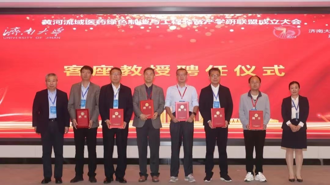 院长李松波教授带队参会。开幕式上,刘宗明、张献明、康荣鑫、吕家亮、张岱州、李松波等领导共同为黄河流域医药绿色制造与工程装备产学研联盟成立揭幕。同时举行了客座教授聘任仪式。我校李松波教授、中国科学院化学研究所研究员宋卫国、太原理工大学教授王宝俊等6人被聘为济南大学客座教授。