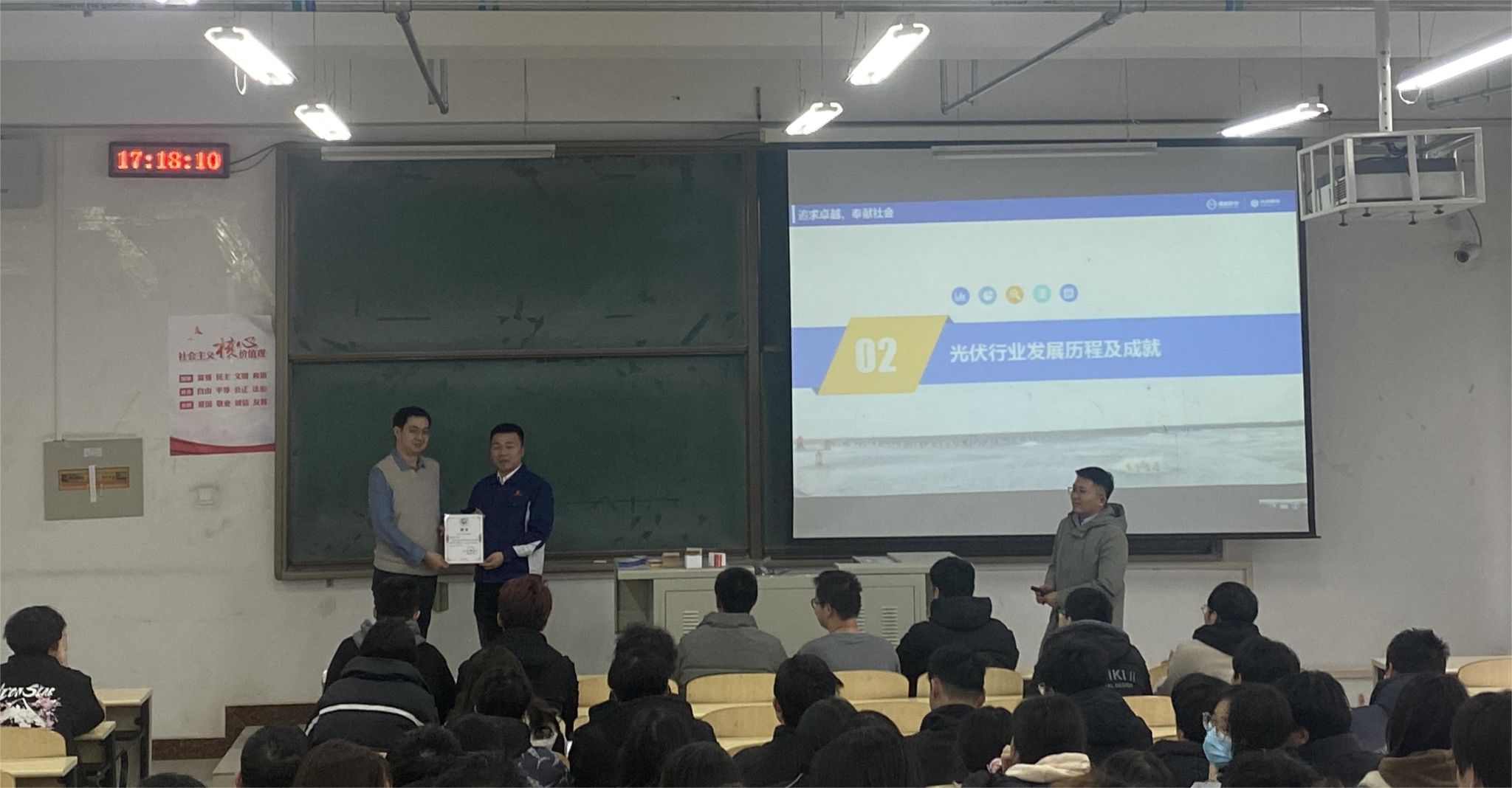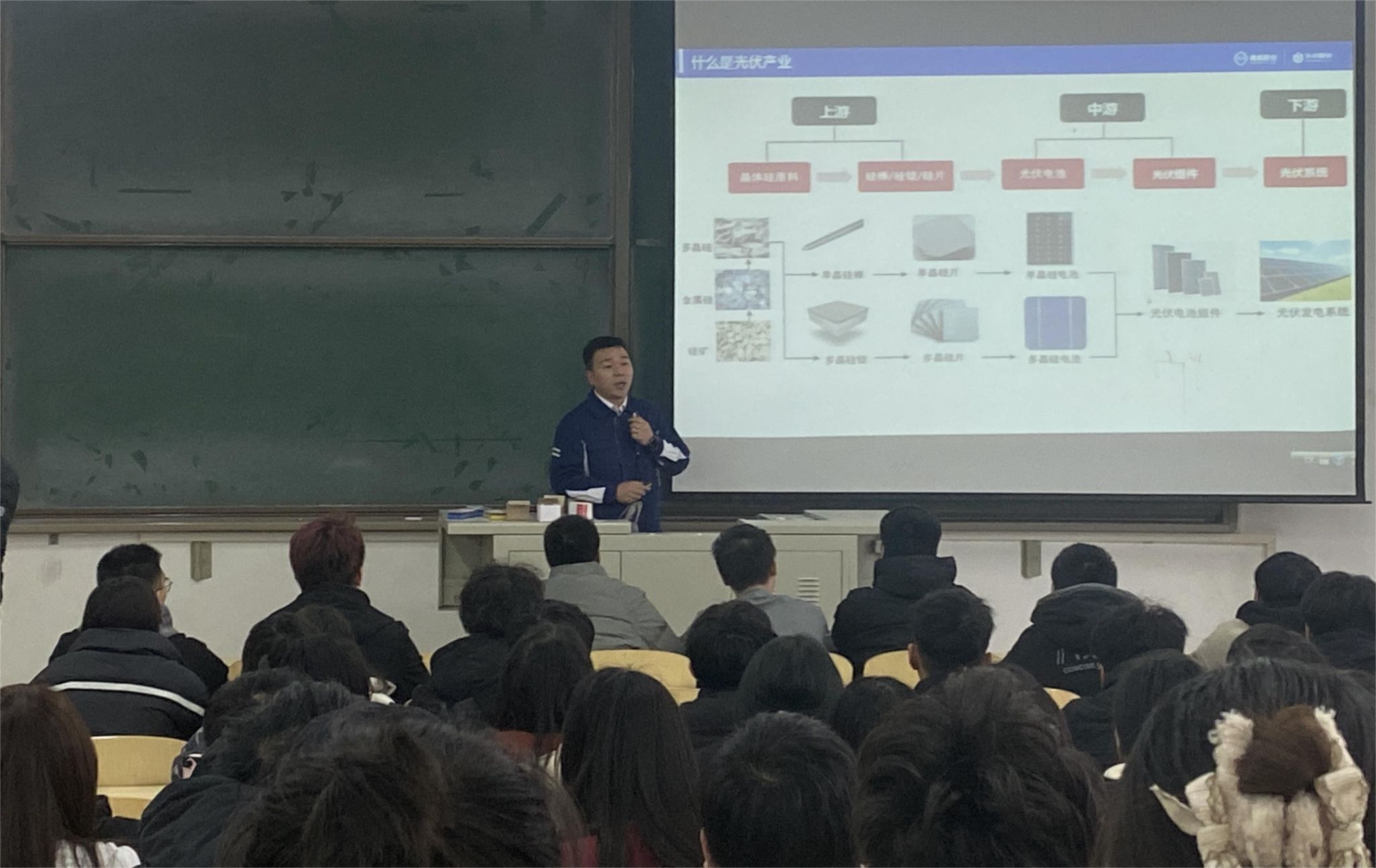 3月5日,硅业学院校企共建课程《新能源技术前瞻》专业课正式开课。本次课程特邀内蒙古通威高纯晶硅有限公司品管部慕道焱部长,讲授光伏行业的发展历程和未来展望。系主任成建国首先对慕部长表示热烈欢迎,介绍了他在光伏产业的卓越贡献和专业素养。课上,慕部长对光伏行业的发展历程和前沿动态倾囊相授,深入剖析了晶硅材料在新能源领域的关键作用,展示了晶硅光伏产业的无限可能性。学生们纷纷表示,本次课程让自己对光伏产业有了更深刻的认识,激发了他们对相关专业知识学习的兴趣,并且进一步明确了要好好学习、服务产业的目标。