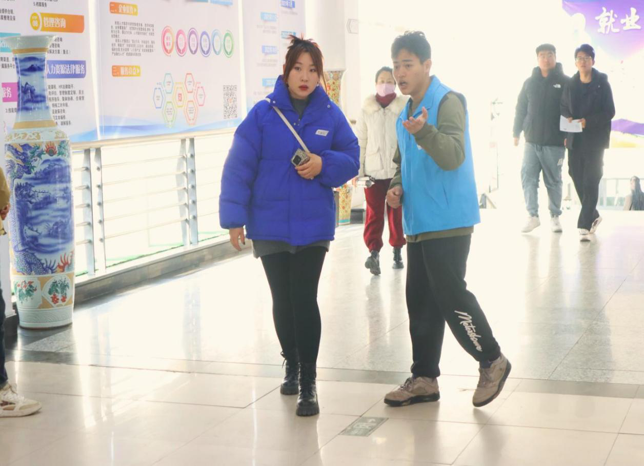 招聘会现场,志愿者统一着装,精神饱满,耐心细致地为前来参加招聘会的求职者提供求职咨询和引导服务,并积极介绍人才招聘信息,主动维护现场秩序,发放政策宣传资料,帮助各企业进行签到、协助企业负责人进行面试。