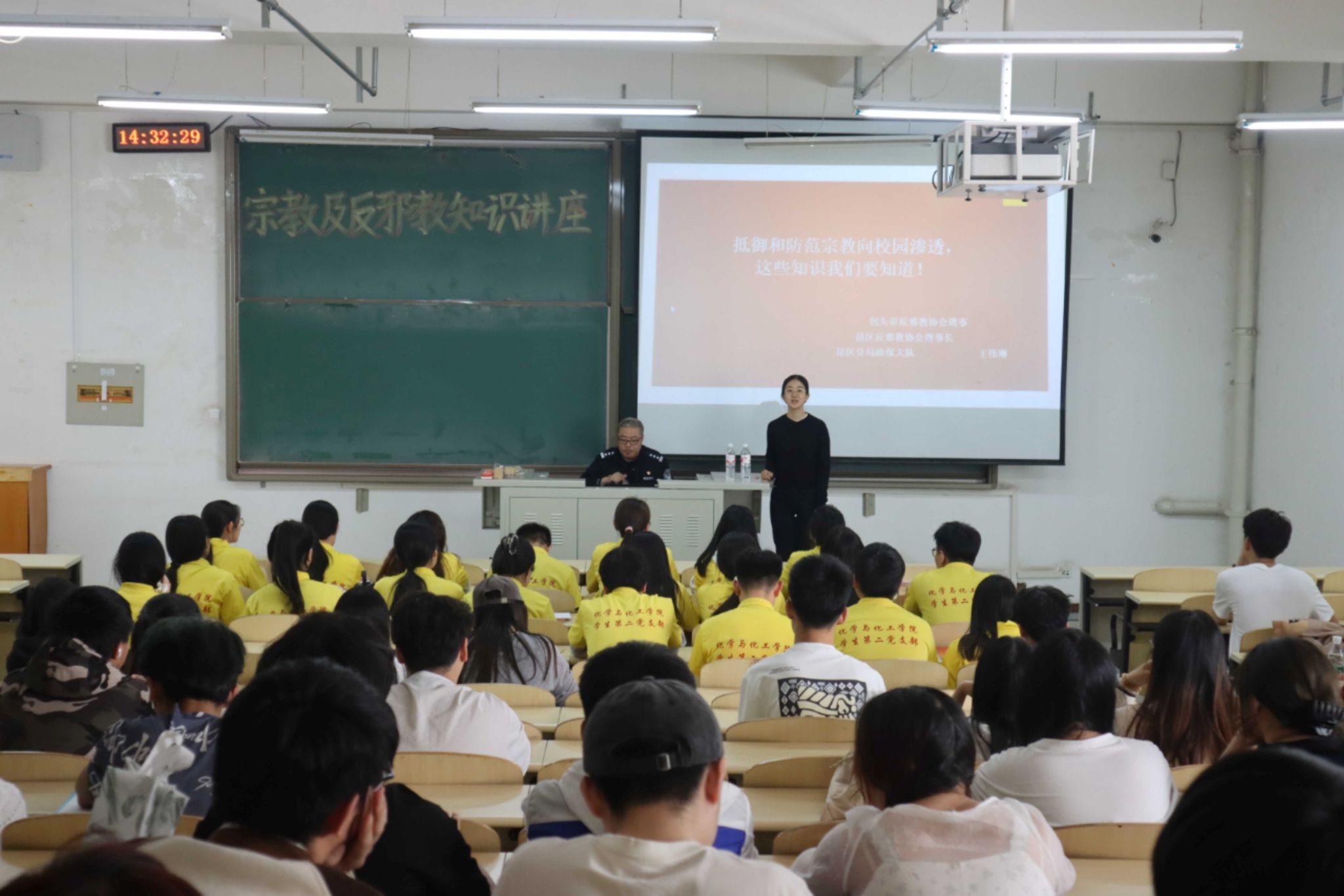 于2024年4月25日下午,在逸夫楼G301教室举办了一场宗教与反邪教知识讲座。此次活动特别邀请了包头市反邪教协会理事王伟琳警官进行现场讲解,学院各班级代表共100余人参加讲座。