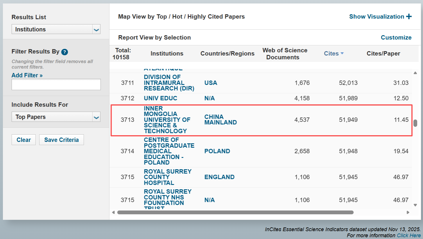 ESI综合排名位居全球3713位,较去年同期提升269位(去年3982),较上期2025年9月提升34位(上期3747),位居中国内地高校348位。