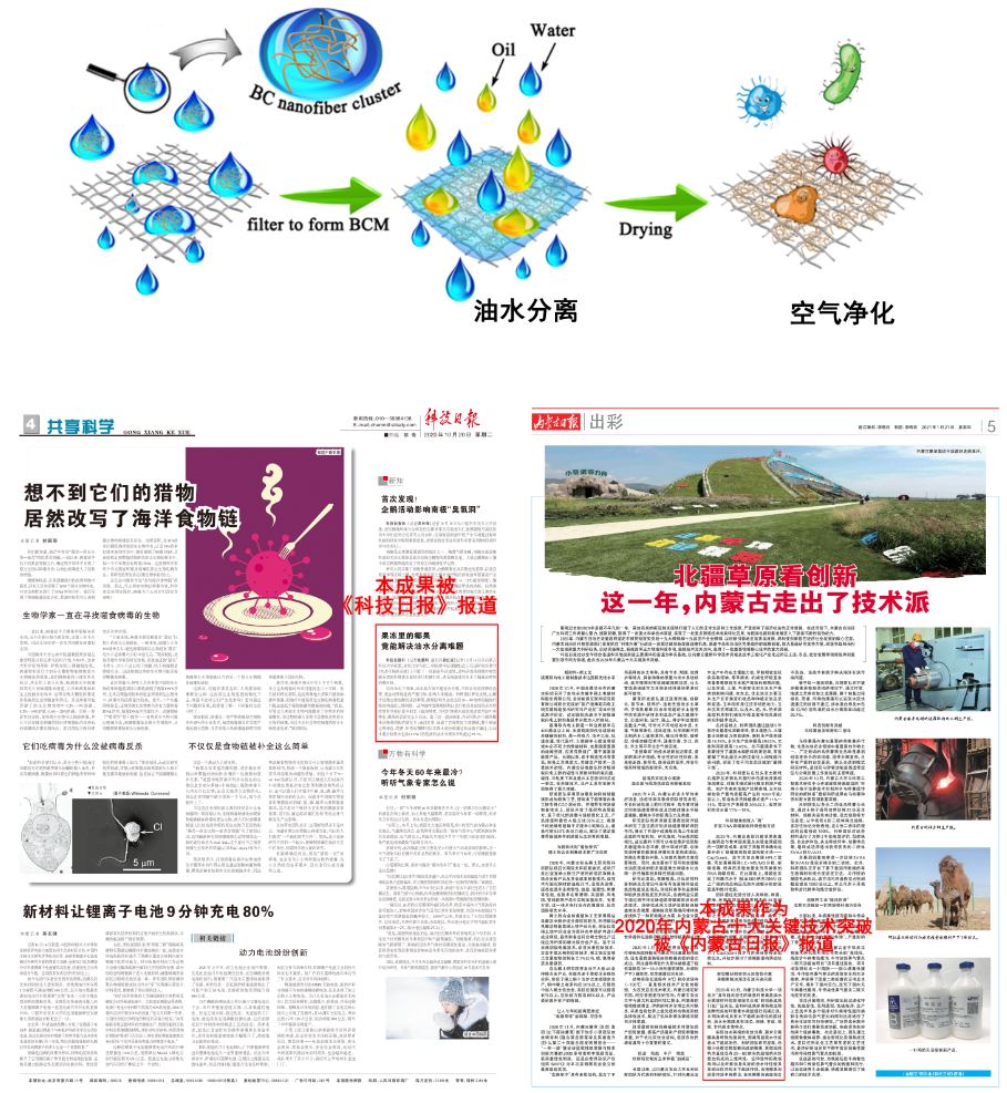 图5.过滤膜的示意图以及《科技日报》和《内蒙古日报》的报道(该成果被评为2020年自治区十大关键技术突破)