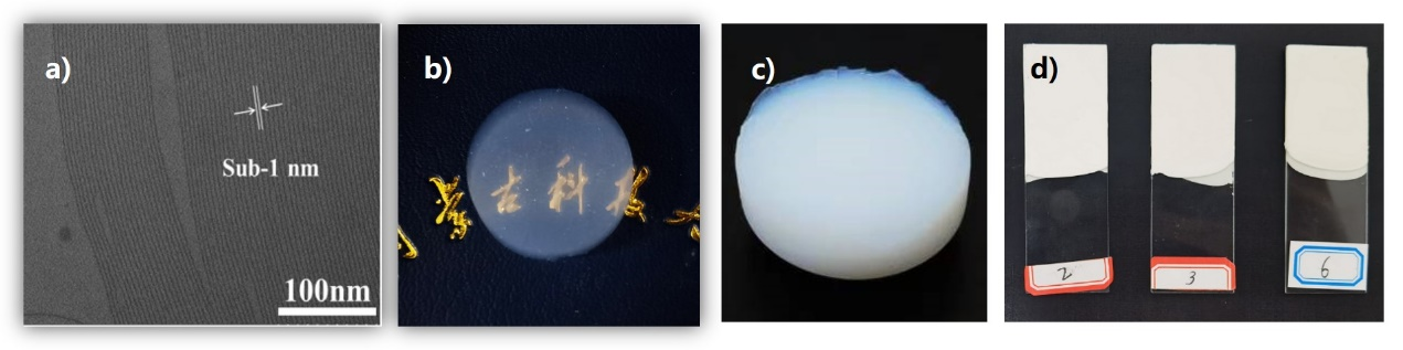 图2.a) GdOOH的亚纳米纤维显微结构;b) GdOOH亚纳米纤维经表面基团调控以后组装而成的气凝胶;c) GdOOH亚纳米纤维作为结构增韧剂制备的高强度SiO2气凝胶;d)镧、铈复合羟基氧化物的亚纳米颗粒作为胶黏剂所制功能涂层。